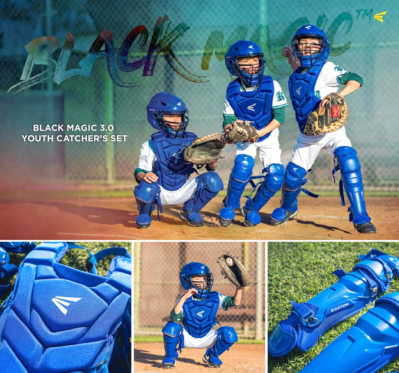 The Easton BLACK MAGIC 3.0 Youth Baseball Catcher's Box Set - Ages 9-12 is built to deliver elite protection and performance for young players taking control behind the plate. Sized specifically for youth catchers, this gear features ergonomic designs that move naturally with the body, helping players stay mobile and protected throughout every inning.